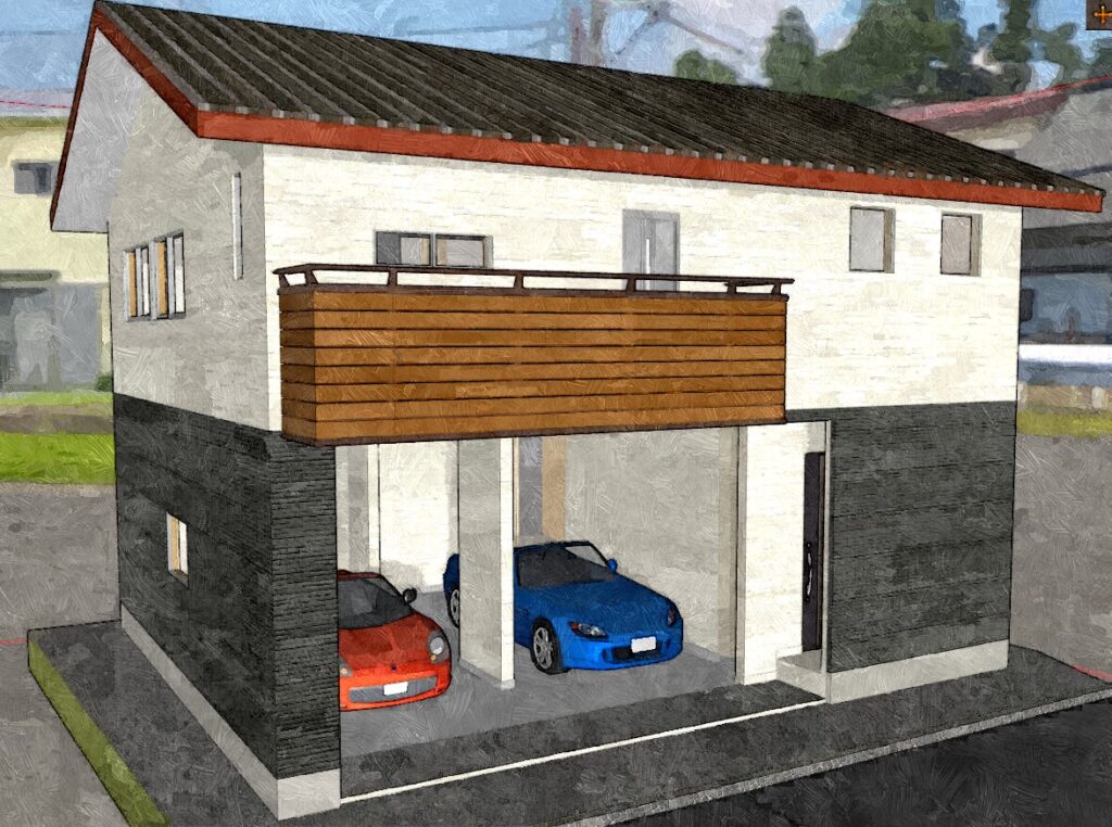 車やバイクが好きなお施主様が趣味の時間を過ごすため、2台分のインナーガレージを1階に、2階を居住スペースにしました。