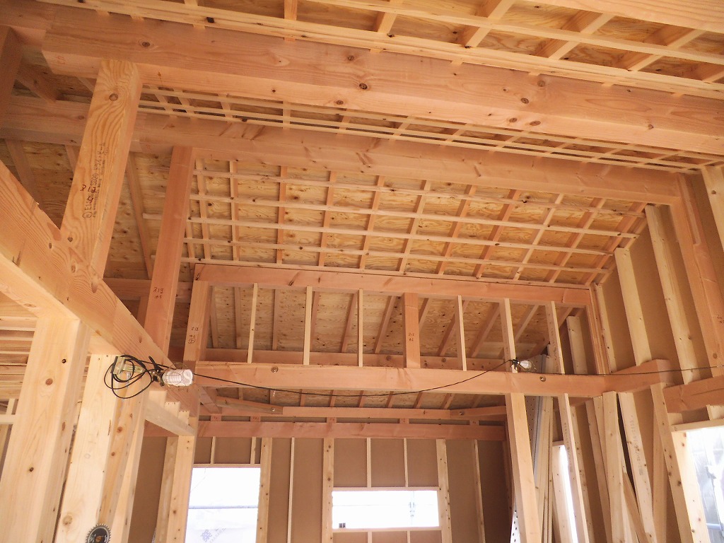2階の小屋裏を利用する事で、収納量が充分なロフトができ、吹き抜けのある広々としたリビングや寝室になりました。