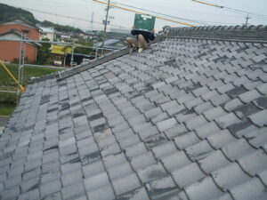 いぶしの日本瓦が欠け、変色していた状態 (「いてた」状態) を心配されていました。以前にも谷の部分での 雨漏りがあり、屋根に関してご不安がおありでした。